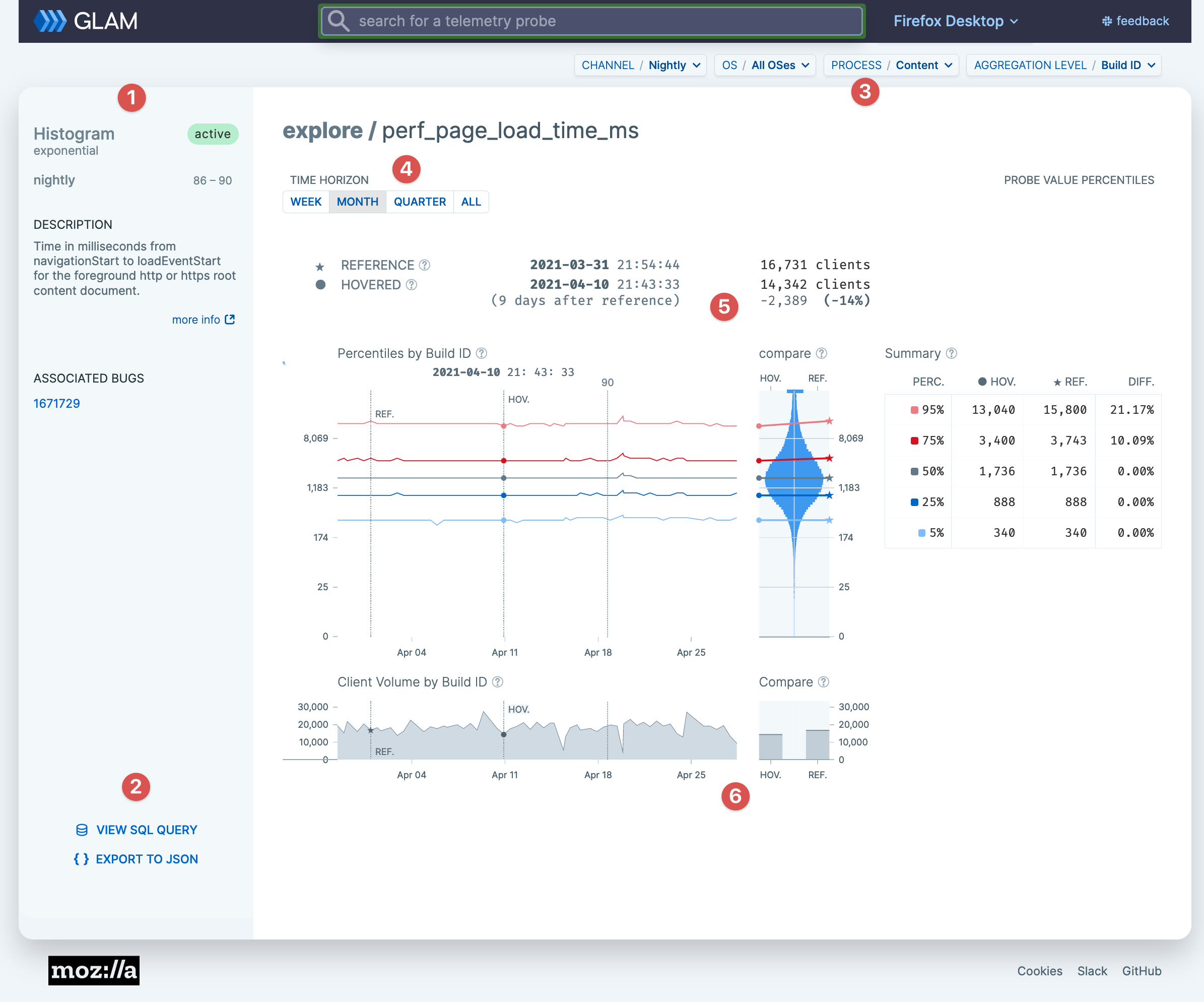 The Glean Aggregated Metrics Dashboard (GLAM) is an interactive dashboard that is Mozilla’s primary self-service tool for examining the distributions of values of specific individual telemetry metrics, over time and across different user populations. It is similar to GUD in that it is meant to be usable by everyone; no specific data analysis or coding skills are needed. But while GUD is focused on a relatively small number of high level, derived product metrics about user engagement (e.g. MAU, DAU, retention, etc) GLAM is focused on a diverse and plentiful set of probes and data points that engineers capture in code and transmit back from Firefox and other Mozilla products.